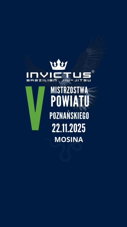 Zapraszamy na V Otwarte Mistrzostwa Powiatu Poznańskiego organizowane przez Invictus BJJ! To doskonała okazja, by sprawdzić swoje umiejętności, rywalizować z zawodnikami z różnych klubów i zdobyć cenne nagrody. Zawody odbędą się w dwóch formułach – Gi oraz No Gi – i są otwarte dla wszystkich, klubów z Polski, pasów oraz kategorii wiekowych i wagowych. Informacje organizacyjne. Projekt współfinansowany ze środków Powiatu Poznańskiego. Data wydarzenia: 22 LISTOPADA 2025 r. Miejsce: ul. Rzeczypospolitej Mosińskiej 1 - OSIR, Mosina 62-050 Kontakt: Maksymilian Wiśniewski tel. 798 503 107 e-mail: zawody@invictusbjj.pl