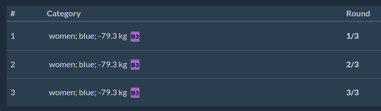 This bracket type can be only used when we have 3 competitors in category. Abbreviation for IBJJF3 is simply IBJJF3 😉