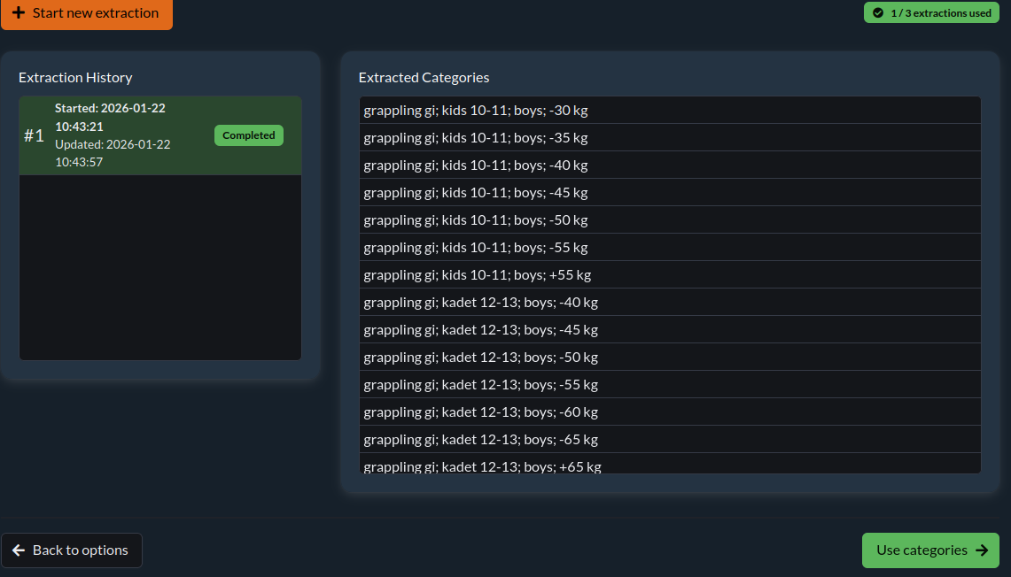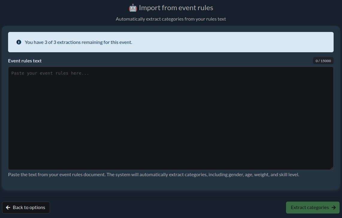 A window with a text area will appear, where you need to paste the content of the rules, where the categories are described. The system will automatically extract categories, taking into account gender, age, weight and skill level. After successful extraction, a summary will appear: