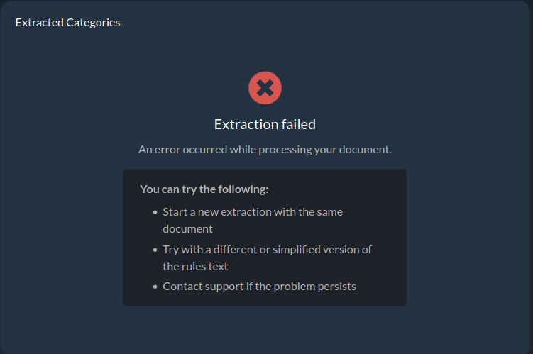 In situations where the system has trouble extracting categories from the rules, the following message will appear: