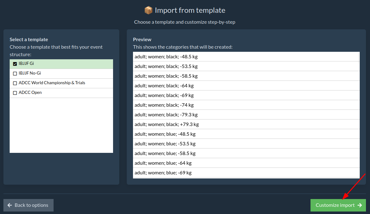 Allows choosing a predefined set of categories and load it into the event and customize to your needs. After clicking the Import from template option, a window with available templates will appear. If you are interested in a different, unavailable template, contact support.