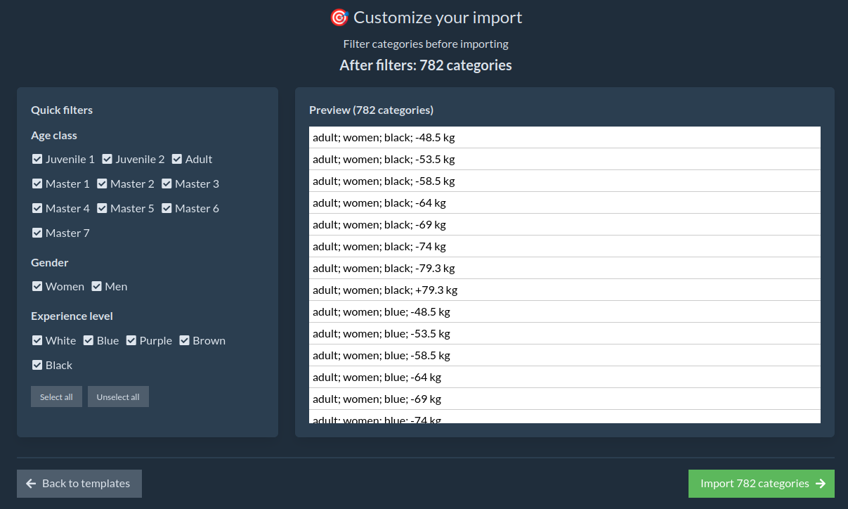 Before importing, you can filter categories by deselecting those you don't need. Filtering is done by clicking the appropriate labels: age class, gender and experience level.