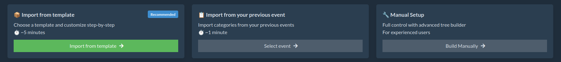 - Import from template — allows choosing a predefined set of categories and load it into the event and customize to your needs.