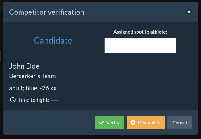 The automatic disqualification is activated when the first fight in the category is displayed on the scoreboard. All competitors with the status Unverified 🔴 will transition to the status Disqualified 🟡.