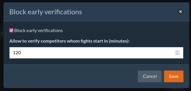To prevent competitors from being verified too early, the system allows you to set a time before the competitor's scheduled fight during which they can be verified. When you click the Block early verifications button, a window will appear where you can enable/disable the option and specify the time in minutes: