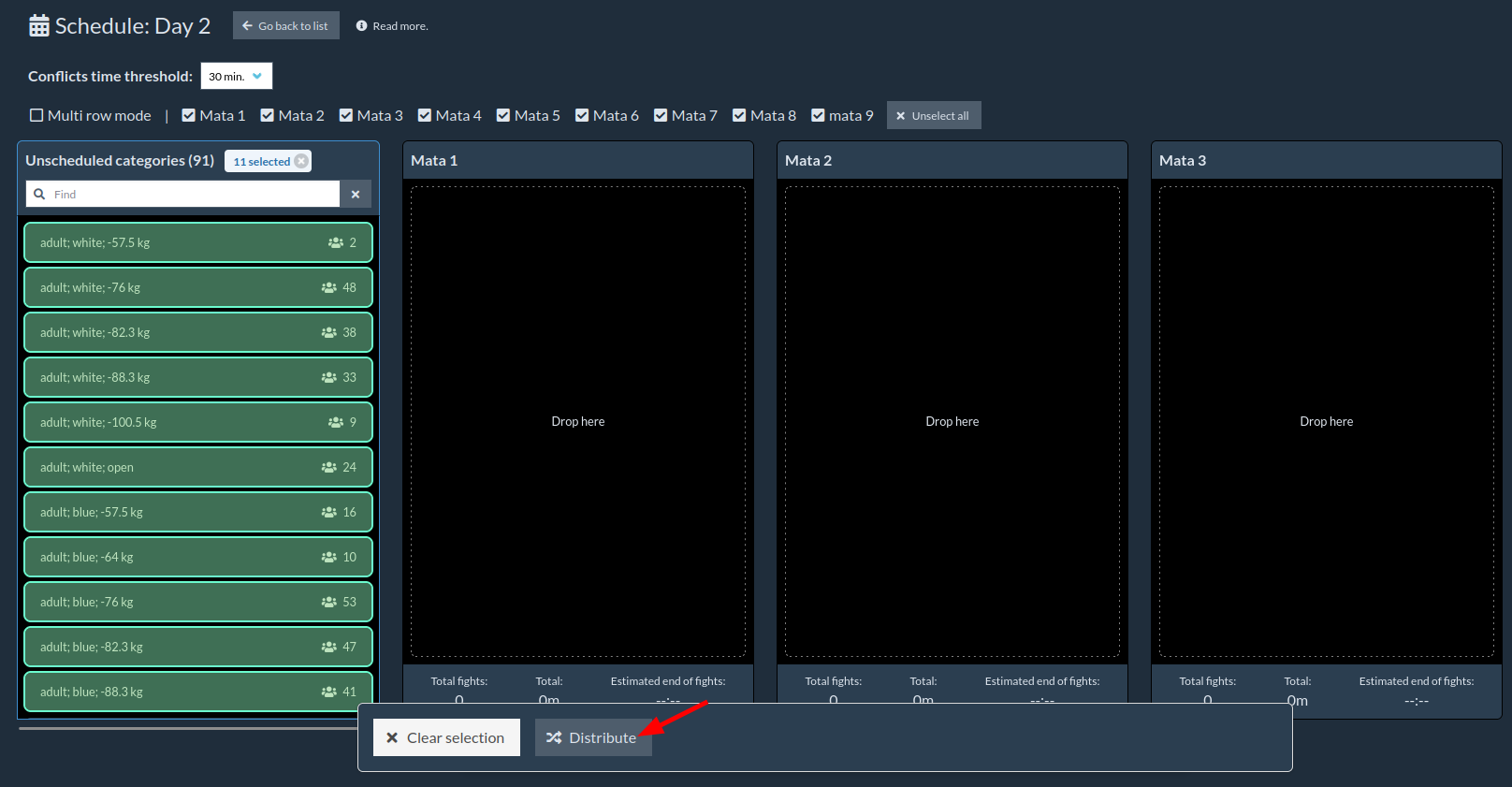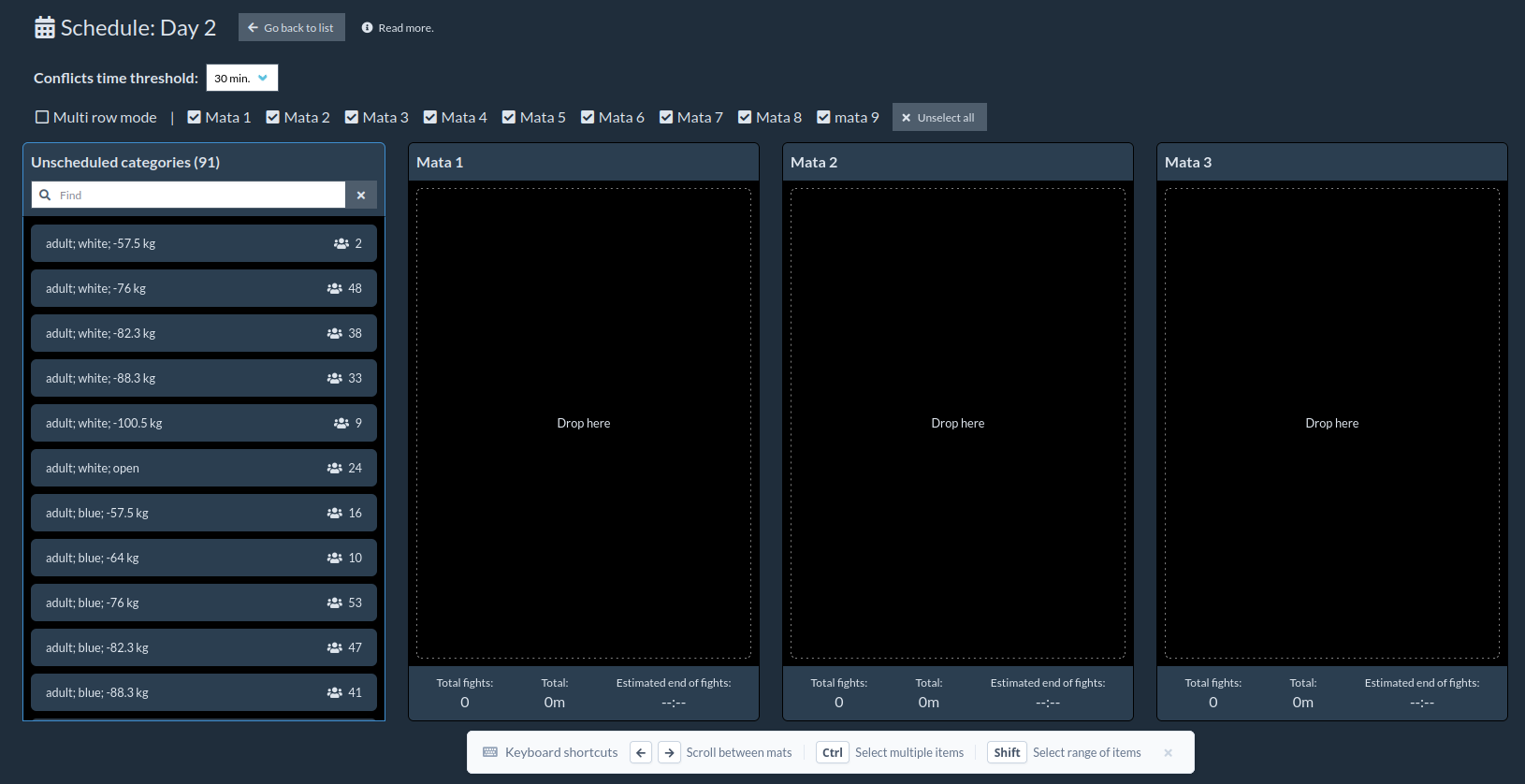 Once all categories are assigned to the mats and conflicts are resolved, you can share the schedule with competitors.