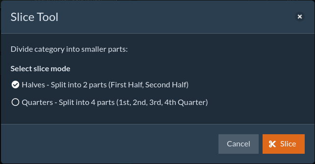 - Halves - the system will divide the category into equal parts (first half, second half),