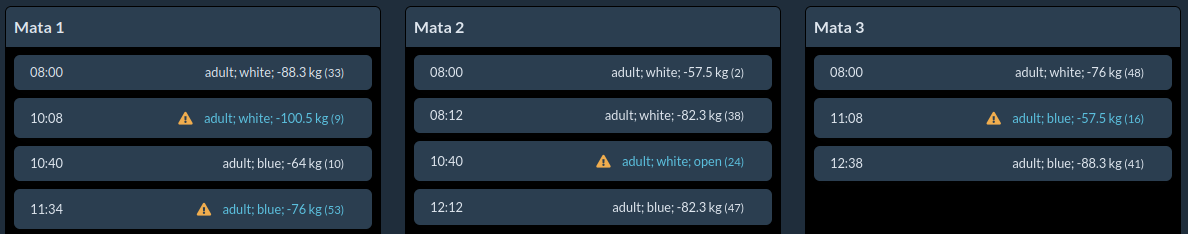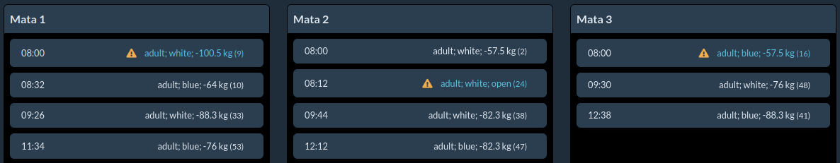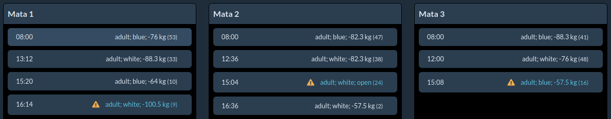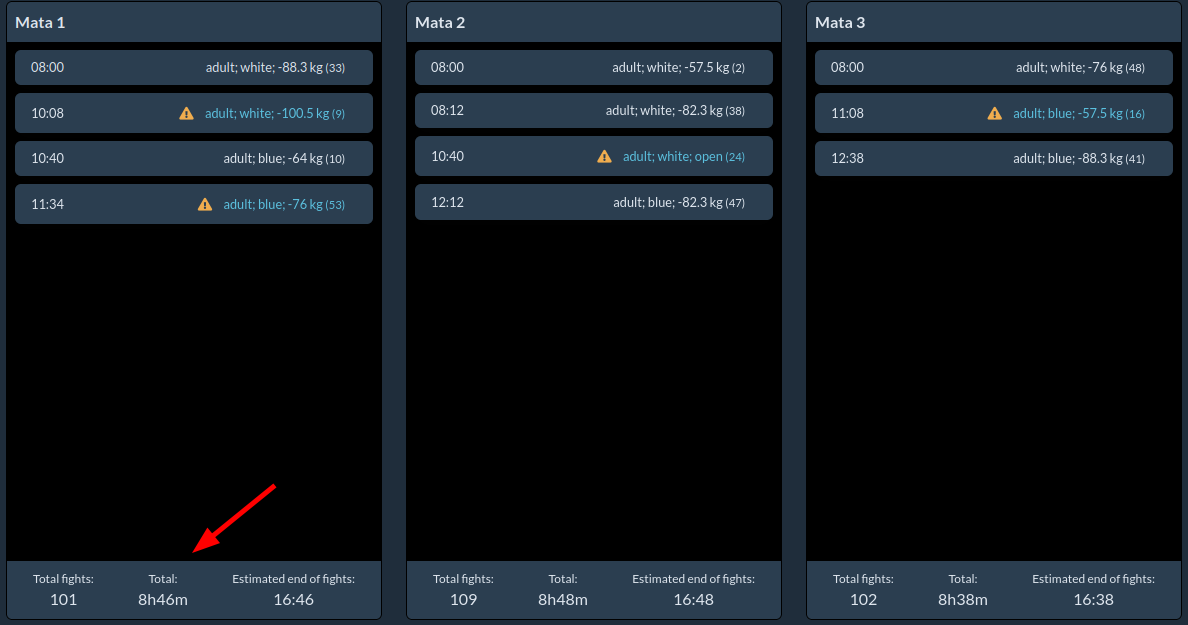 At the bottom of each mat, we see a summary with the number of fights, estimated duration, and estimated time of completion.
