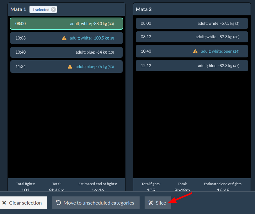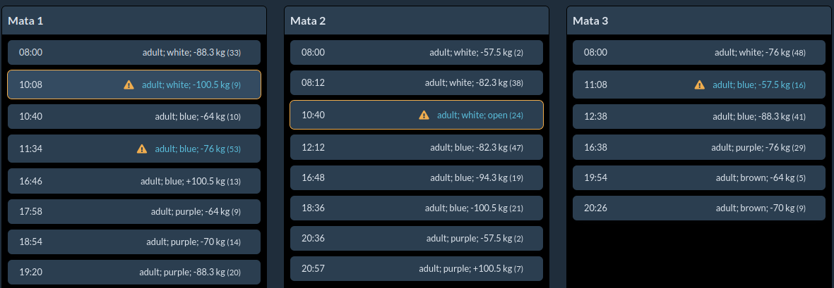 Conflicts occur when the same competitor fights in two categories and when both categories have fights at the same time. This can lead to a situation where the competitor has to be on two mats at the same time 😁.