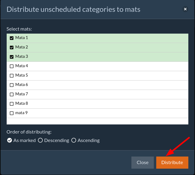 After selecting the categories, you can manually move them to the selected mat by dragging them with the mouse cursor. If you want to assign categories to multiple mats, you can do this using the Distribute button.