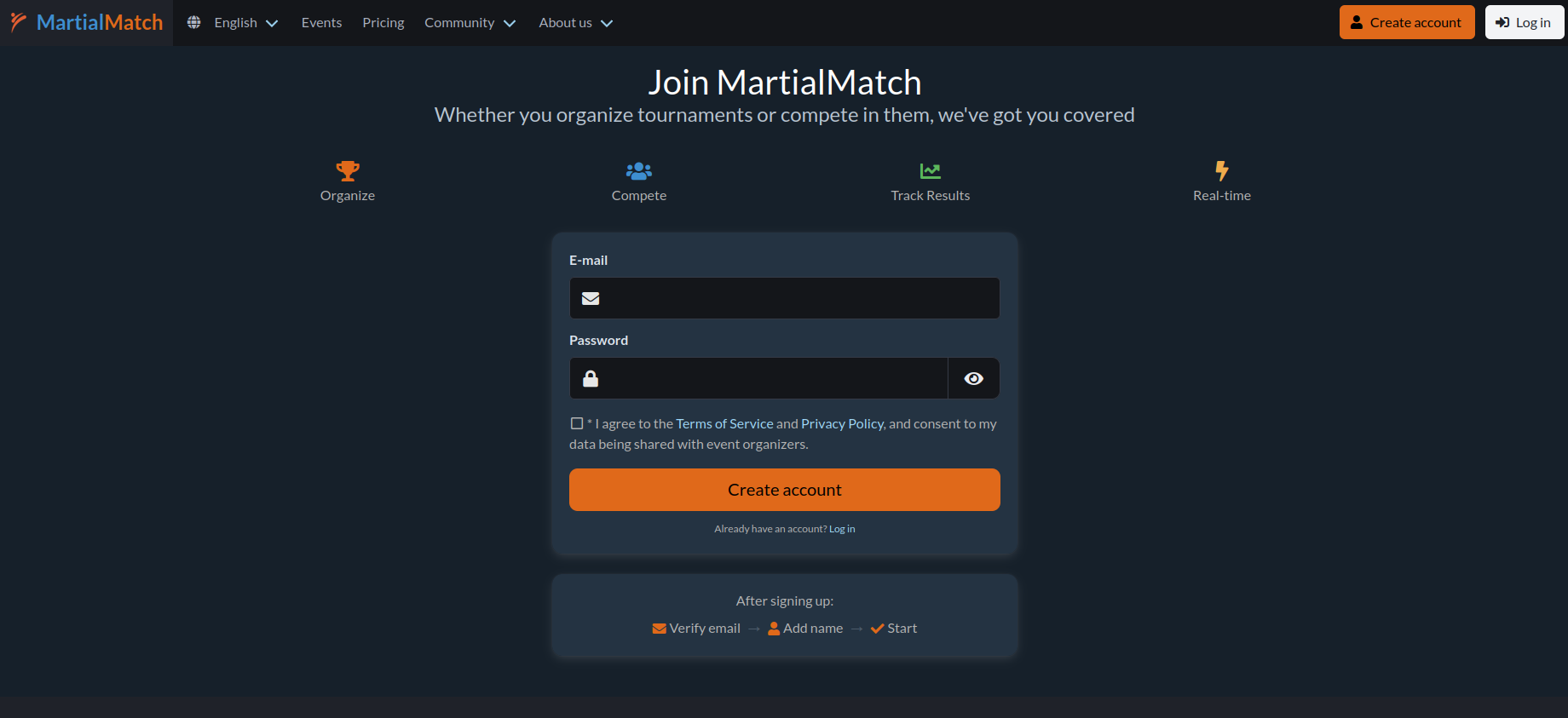 To register a competitor for an event in MartialMatch, you need a user account.