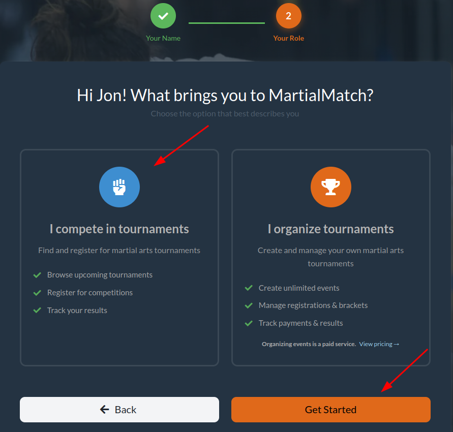 After activating your account, you will be asked to choose your primary role in the system. Select I compete in tournaments and click Get Started.