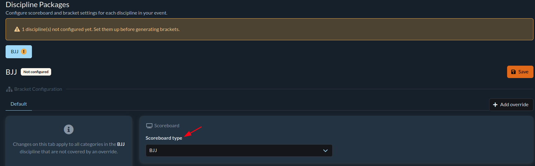 - Scoreboard variant — which scoreboard implementation to use for all fights in this discipline (e.g. standard BJJ, BJJ Blue/Red).