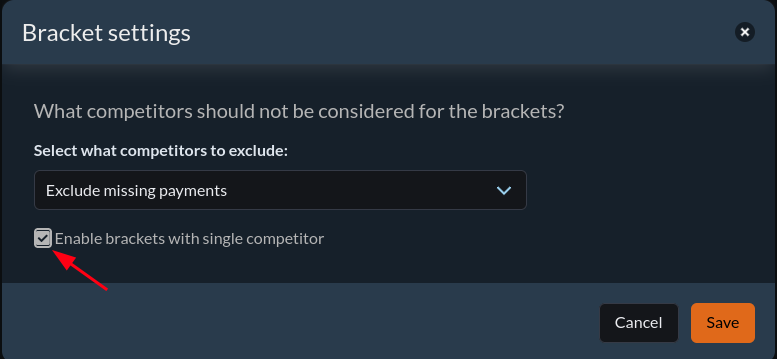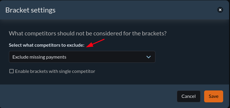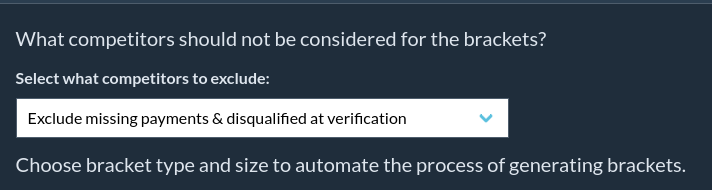 - Exclude missing payments — registered competitors who have not paid their registration will not be included in the brackets.