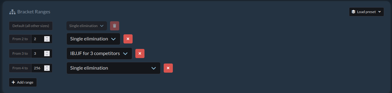 - Bracket ranges — size → bracket type mapping (e.g. 2–3 competitors → Round Robin, 4+ → Single Elimination).