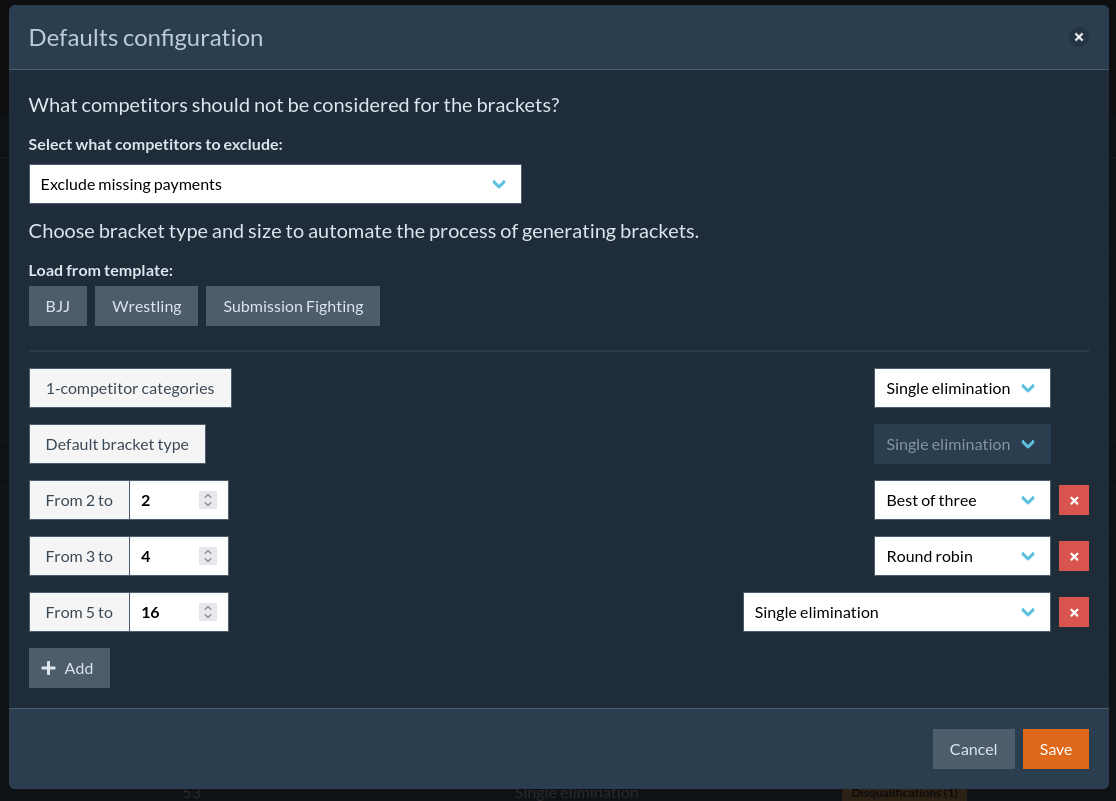 - No exclusions — all competitors will be included in the brackets; this option is particularly helpful when estimating the duration of the competition in the most pessimistic case.