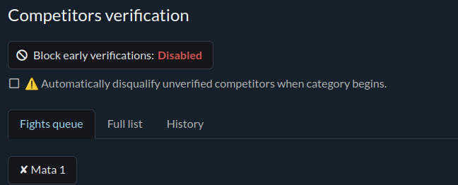 Before any competitor can compete, they must pass a verification stage and be marked as verified in the system. For this purpose, there is a module available in the Competitors menu under Competitors verification.