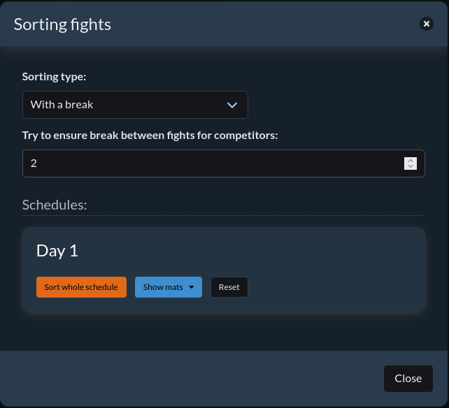 - With a break - For the same competitor, between different fights, the system will try to insert fights from another category to give the competitor a break. We can specify how many fights the system should set as a break (default 2).