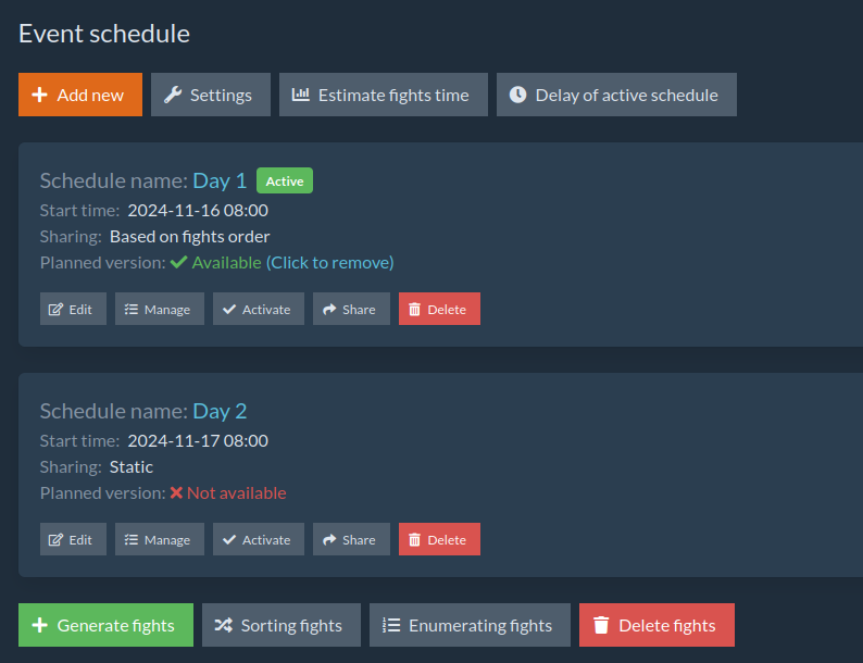 To be able to share such a schedule, we must first generate fights for it and then sort them (either automatically or manually).