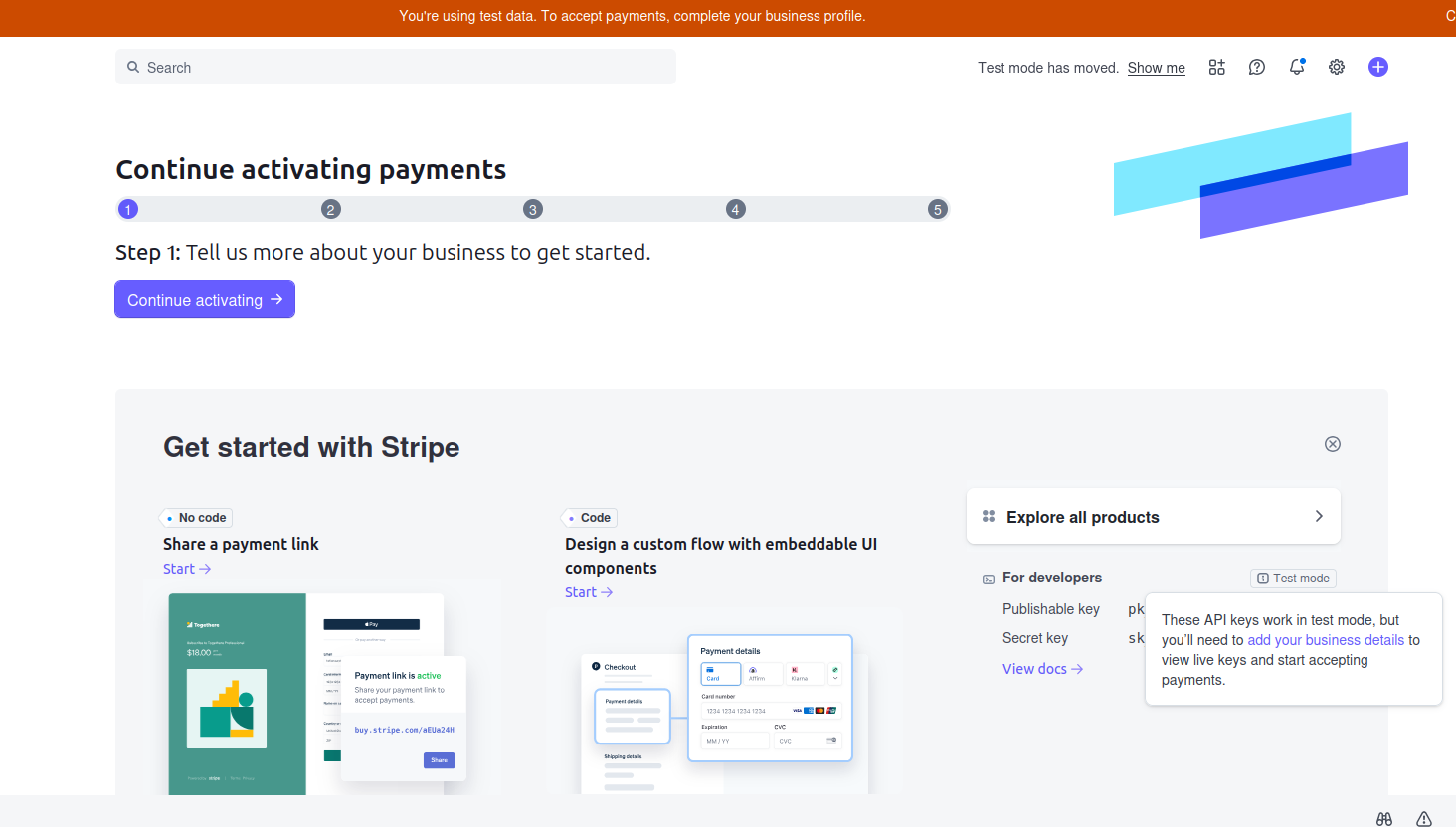After logging in, open the Stripe dashboard. You should see a screen like this: