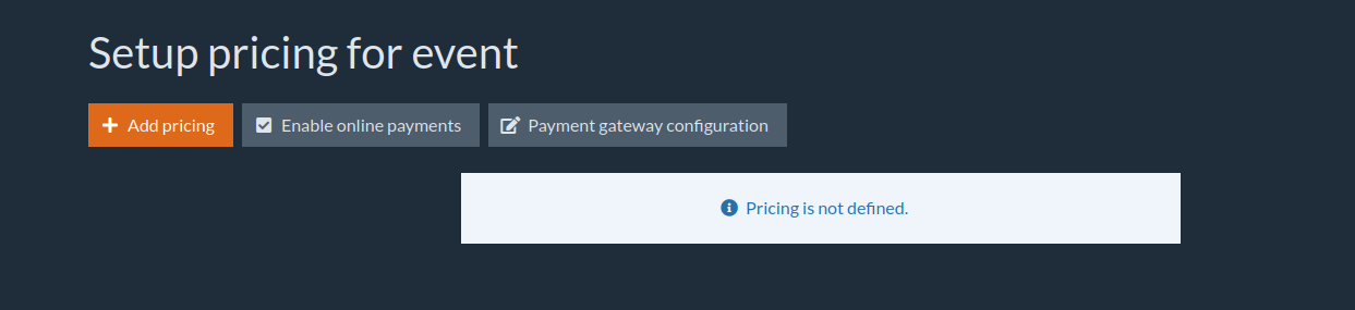 After configuration you can define pricing for your event. For details on pricing setup, see Configure online payments for your event.