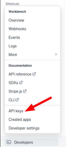 In the Stripe dashboard, open the Developers menu and select API keys.