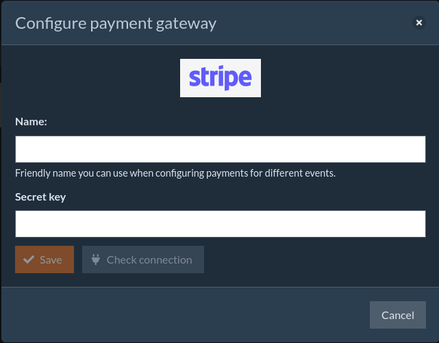 Click Payment gateway configuration. In the dialog that appears, choose Stripe and paste your API key. Give the configuration a name (for example, Stripe) so you can identify it later.