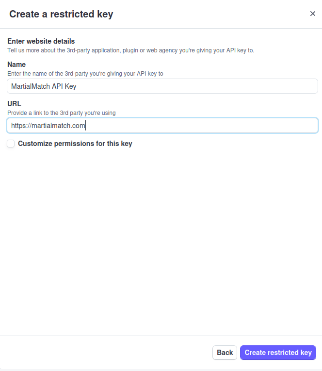 Click Create restricted key. Copy the generated key — you will paste it into MartialMatch.