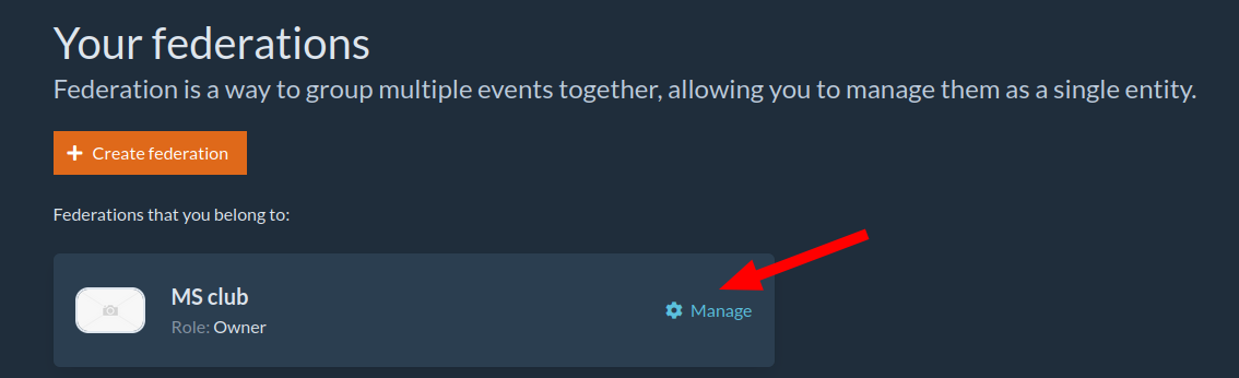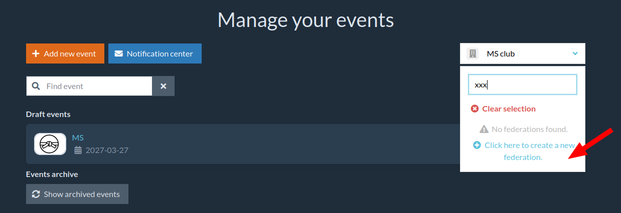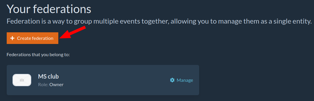 - Select the Manage events option. In the federation search window, you have the option to create a new federation.