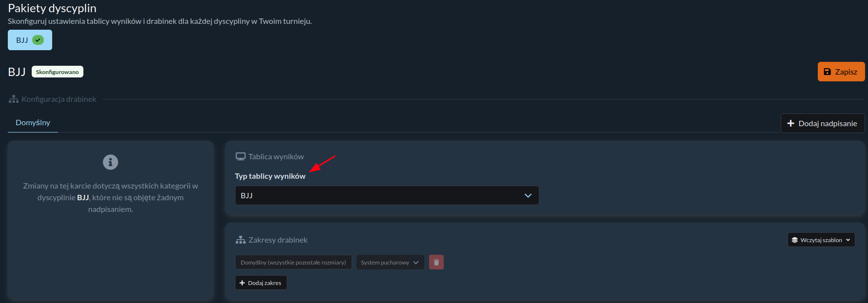 Uwaga: Ustawienie dyscypliny określa jedynie jakiemu sportowi przynależą kategorie. Konkretny wariant tablicy punktowej (np. BJJ niebieski/czerwony vs standardowe BJJ) oraz reguły typów drabinek są konfigurowane osobno w Pakietach dyscyplin, dostępnych ze strony Drabinki.