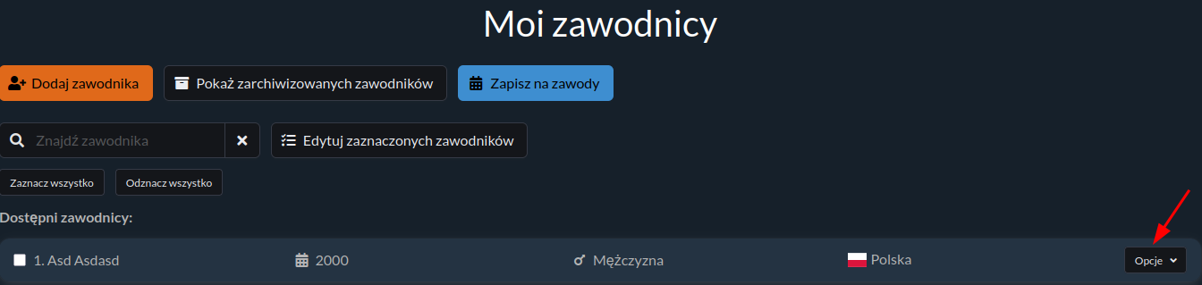 - Kliknij przycisk Opcje obok wybranego zawodnika.