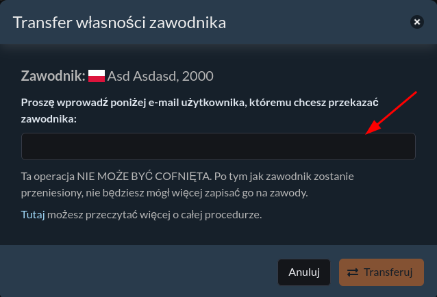 - Wpisz adres e-mail użytkownika, na którego konto chcesz przenieść zawodnika.