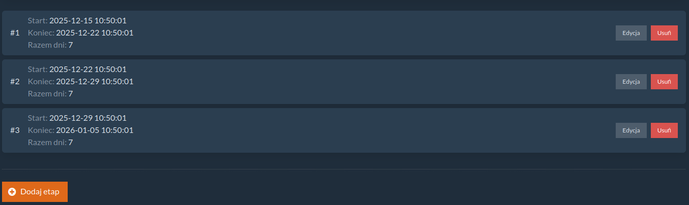 Konfigurację cen musimy powtórzyć dla każdego etapu rejestracji.