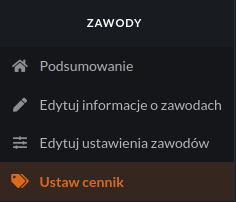 Aby skonfigurować bramkę płatności dla Twojego wydarzenia, należy przejść najpierw do panelu administratora i następnie otworzyć zakładkę Zawody i Ustaw cennik.