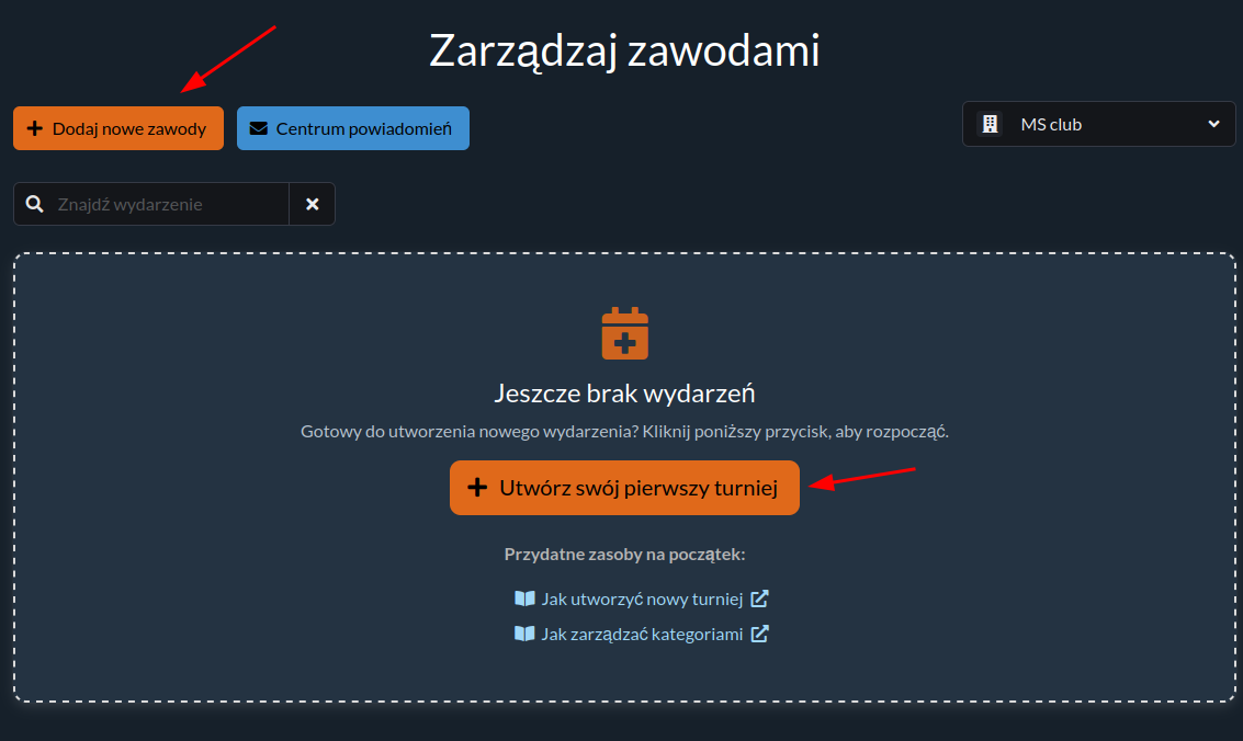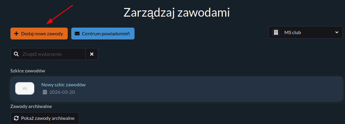 Na nowej stronie kliknij Dodaj nowe zawody.