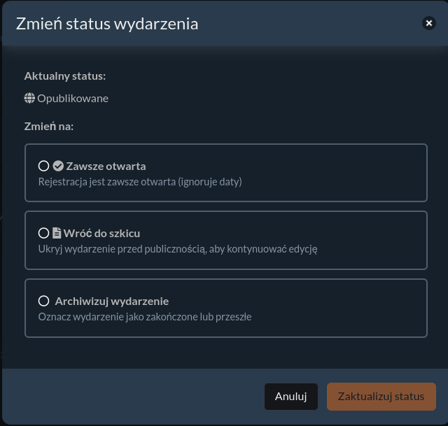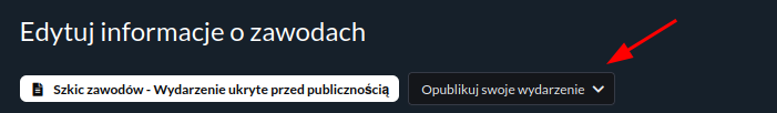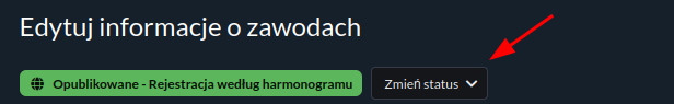 Status zawodów można edytować, klikając przycisk Zmień status.