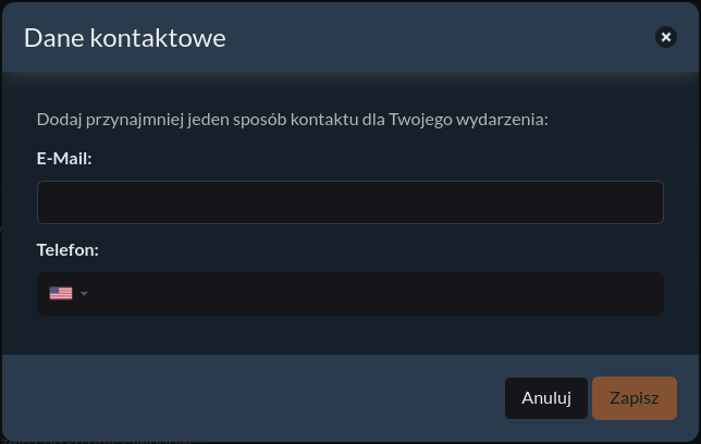 Następnie pojawi się okno z formularzem dotyczącym danych kontaktowych organizatora. Po uzupełnieniu tych danych i kliknięciu przycisku Zapisz zostanie utworzony szkic nowych zawodów.