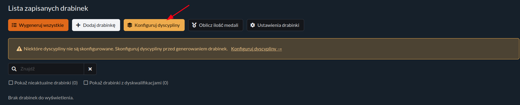 Pakiety dyscyplin należy konfigurować po zamknięciu rejestracji i przed wygenerowaniem drabinek. Jeśli jakakolwiek dyscyplina wykryta w zawodach nie jest skonfigurowana, na stronie Drabinki pojawi się ostrzeżenie z bezpośrednim linkiem do strony Konfiguruj dyscypliny. Masowe generowanie drabinek nie będzie możliwe, dopóki wszystkie dyscypliny nie zostaną skonfigurowane.