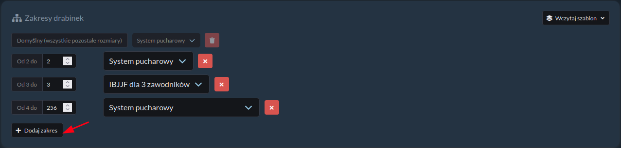 Kliknij Dodaj zakres, aby dodać nowy wiersz. Każdy wiersz określa zakres liczby zawodników i typ drabinki do wygenerowania dla tego zakresu.