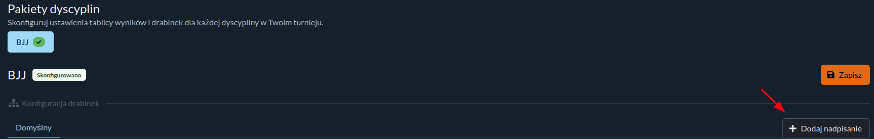 Grupy nadpisań umożliwiają zastosowanie innych reguł drabinek do określonego podzbioru kategorii w ramach tej samej dyscypliny, przy zachowaniu reguł z zakładki Domyślne dla wszystkich pozostałych kategorii.