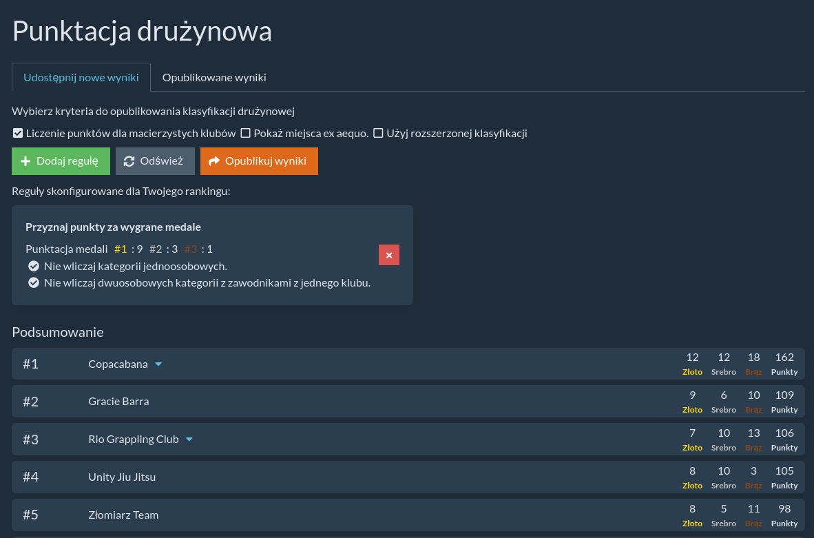 Na jeden opublikowany ranking klubowy, można wybrać wiele reguł. Jeżeli np. chcemy przyznać punkty za zdobyte miejsca oraz dodatkowo punkty za wygrane walki, to możemy połączyć te dwie reguły.