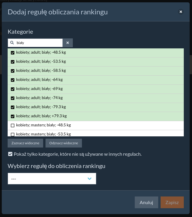 W trakcie definiowania każdej z reguł wymaganym krokiem jest wybranie kategorii, które będą brane pod uwagę w trakcie obliczania punktacji drużynowej. Można wybrać wszystkie kategorie lub tylko niektóre. Służy do tego lista z prostym filtrem, który ułatwia wyszukiwanie kategorii.