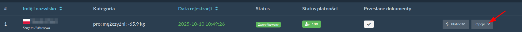 - Na nowej stronie wyszukać zawodnika i kliknąć Opcje przy jego nazwisku, aby przejść do Edycji danych zawodnika.
