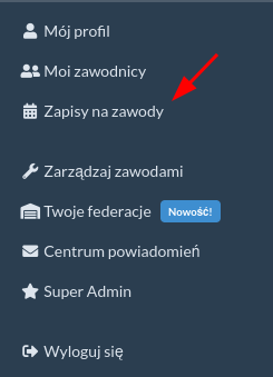 - W menu w prawym górnym rogu strony wybrać Zapisy na zawody.