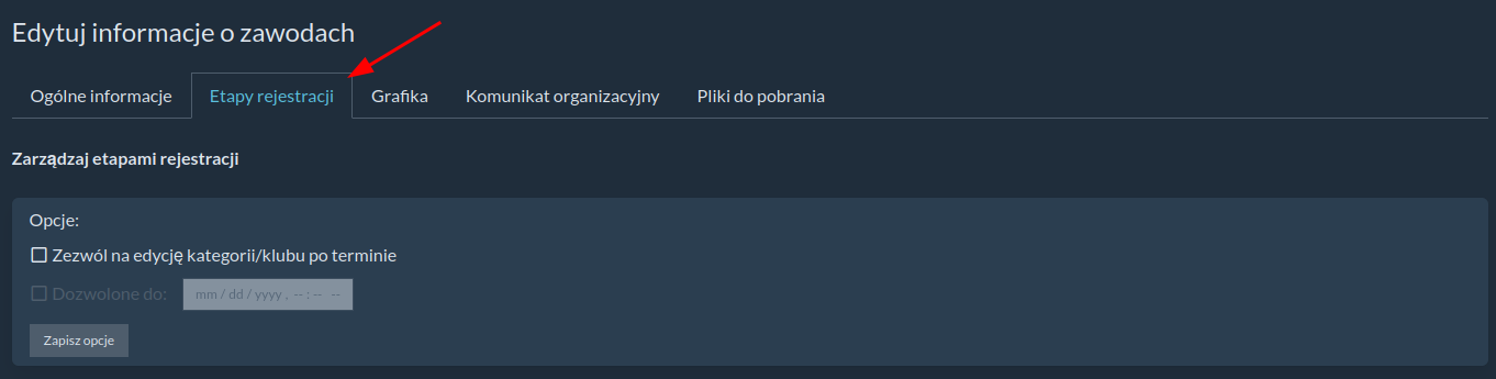 Etapy rejestracji będą widoczne na stronie Zarządzanie rejestracjami w menu Zawodnicy.