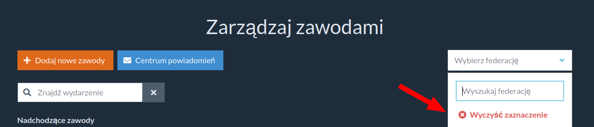 💡 Uwaga: Na stronie zarządzania zawodami możesz zobaczyć wszystkie opublikowane, szkice i zarchiwizowane zawody, które utworzyłeś. Wszystkie zawody, do których masz dostęp, można przypisać do federacji.