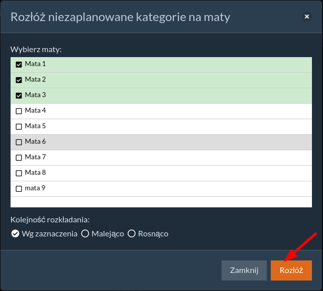 Po zaznaczeniu kategorii, możemy ręcznie przenieść je na wybraną matę przeciągając je kursorem myszy. Jeżeli chcemy przypisać kategorie na wiele mat, możemy to zrobić za pomocą przycisku Rozłóż.