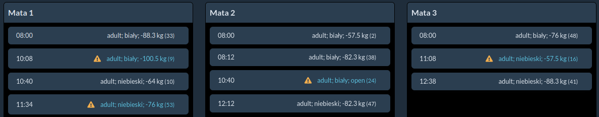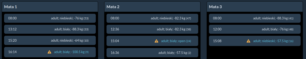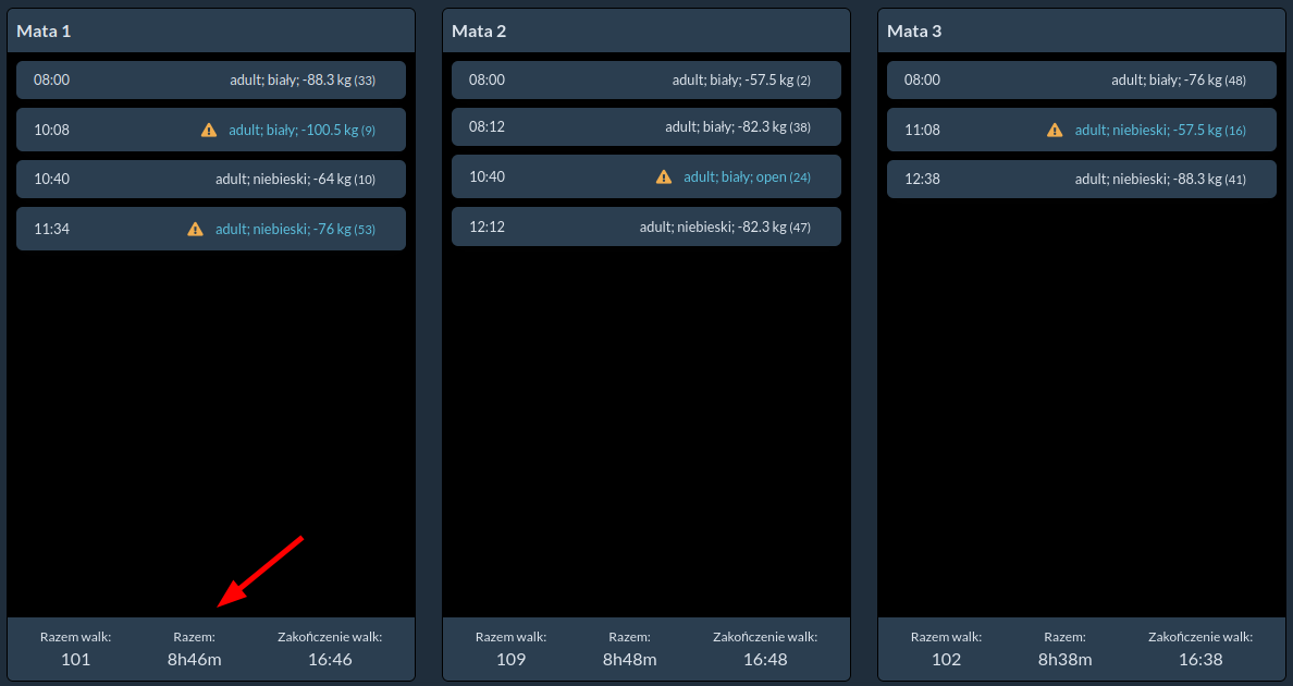 Dodatkowo na dole każdej maty widzimy podsumowanie z liczbą walk, szacunkowym czasem ich trwania oraz szacowaną godziną zakończenia wszystkich walk na danej macie.