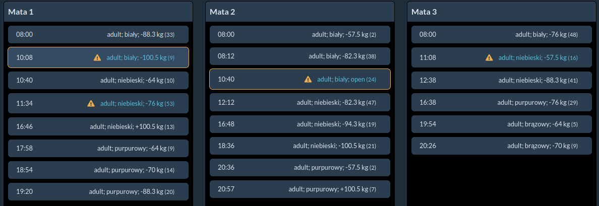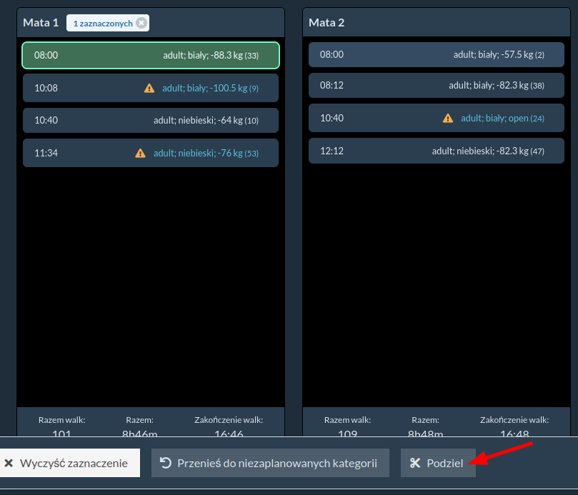 Konflikty mogą wystąpić, gdy ten sam zawodnik walczy w dwóch kategoriach i gdy obie kategorie mają przeprowadzane walki w tym samym czasie. Może to doprowadzić do sytuacji, gdzie zawodnik będzie musiał być na dwóch matach jednocześnie 😁.