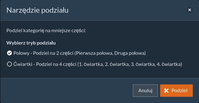 Aby podzielić jedną kategorię na części, należy ją zaznaczyć i kliknąć przycisk Podziel.